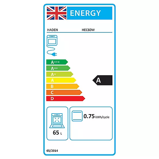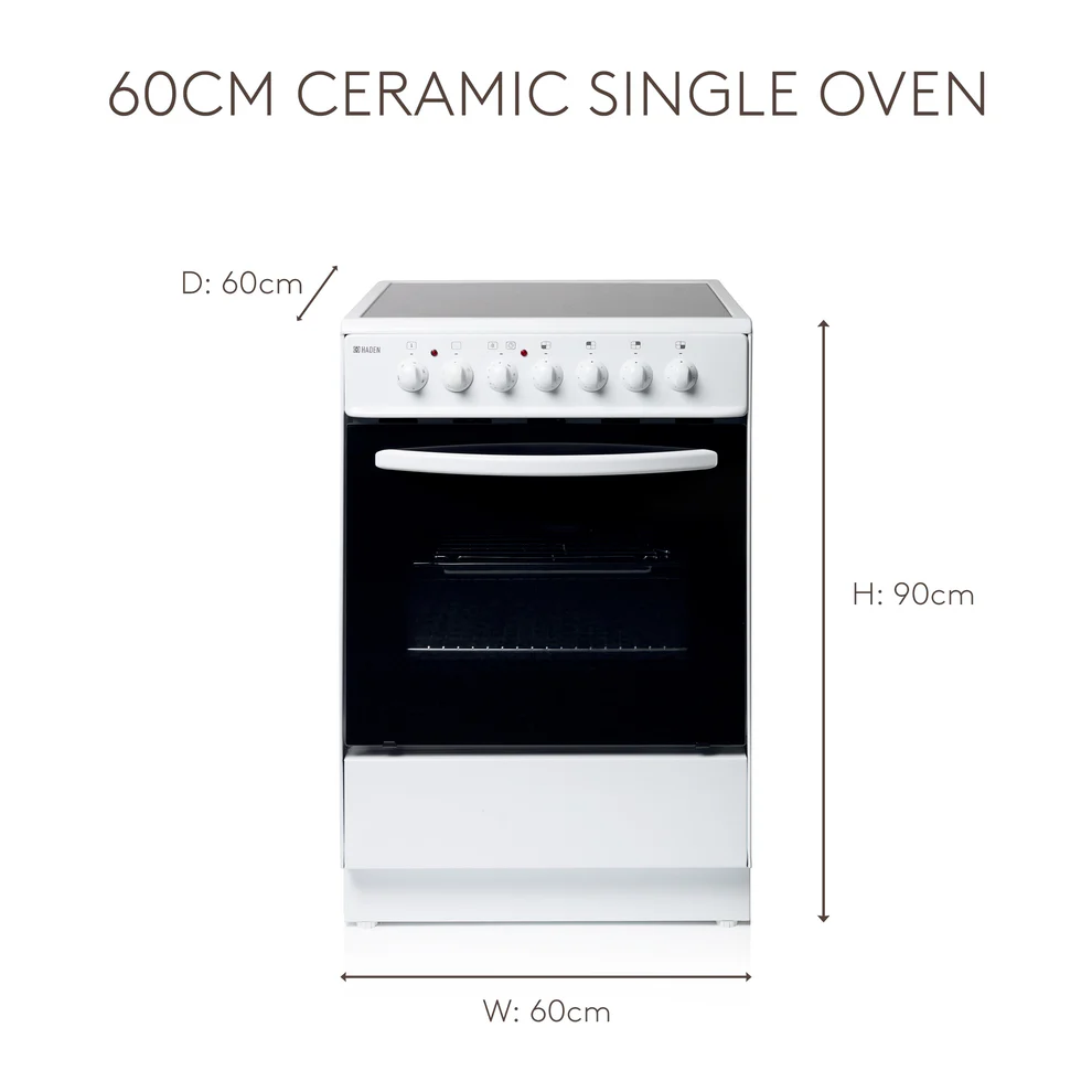 HADEN HEC60W 60cm Electric Single Cavity Cooker with ceramic hob: Haden free standing electric cooker features a single cavity oven with a 64ltr capacity, grill pan with handle and wire griddle, 4 zone ceramic hob and is A energy rated.